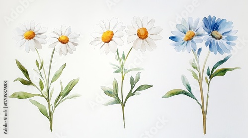 Vivid and bright three-piece natural watercolor painting of a chamomile branch, depicted in stunning detail on a white background. Ideal for floral, nature, and botanical design concepts.
