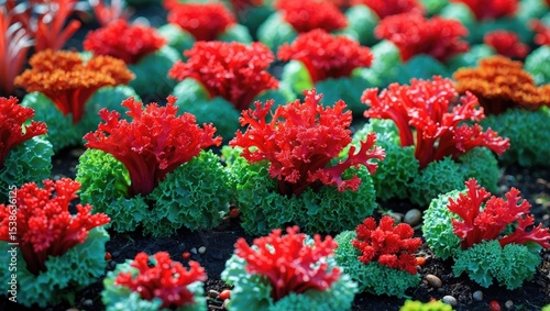 Vivid close-up of vibrant red coral salads and red oak lettuce in a natural garden setting