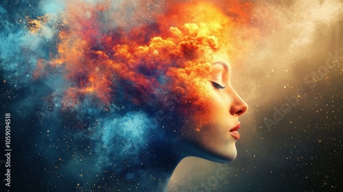 profile, cloud, cosmic, high-coloured, female, introspection, dream, universe, thought, artistic, aethereal, serenity, expressionism, vibrant, imagination, meditation, timeless, fantasy, surreal, conceptual, creativity, visionary, wonder, harmony, elegance, beauty, contemplative, peace, innovation, modern, expression, abstract, radiance