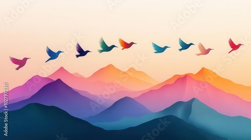 Vivid dreamlike birds made of abstract colors flying over a surreal mountain range, symbolizing freedom of thought
