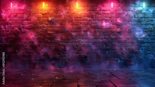 Vivid neon lights bathe a textured brick wall, creating a visually stunning and dynamic atmosphere