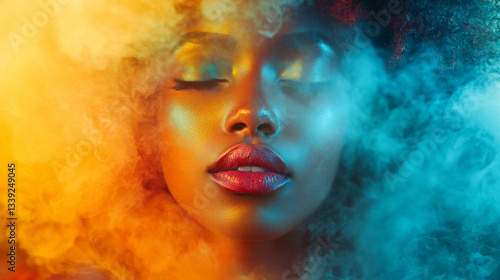 woman, portrait, colourful, vibrant, smoke, orange, blue, dreamy, surreal, beauty, face, closeup, glowing, lighting, dramatic, artistic, mysterious, aethereal, peaceful, serene, expression, creativity, abstract, make-up, lip, eye, afro, hair, fashion, style, bold, modern, aesthetic, atmospheric, sensual, futuristic, dreamlike, elegance, radiant, striking