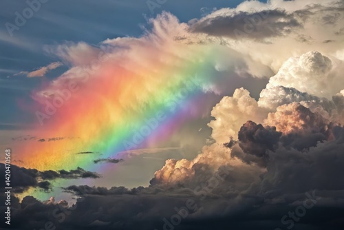 rainbow, cloud, sky, colours, nature, afternoon, weather, beauty, light, phenomena, atmosphere, storm, scenery, landscape, sunlight, air, horizon, formation, fluffy, serene, display, daylight, high-coloured, sunshine, lover, visual, illusion, magic, inspiration, aethereal, wonders, calmness, joy, environment, summer, captivating, moment, happiness, generative, ai