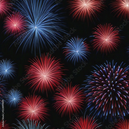 Vivid red and blue fireworks against a dark night sky, creating a festive celebration atmosphere, AI generated