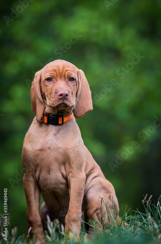 Vizla dog portrait in green background. Vizla puppy outside in kennel.