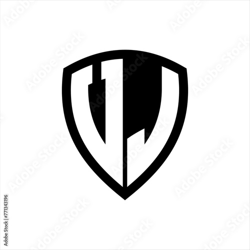 VJ monogram logo with bold letters shield shape with black and white color design