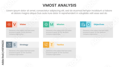 vmost analysis model framework infographic 5 point stage template with rectangle box information concept for slide presentation