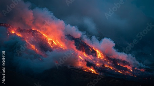 Volcanic eruption flowing lava night