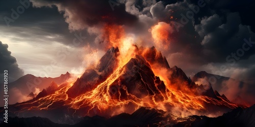 Volcanic eruption lava flowing smoke billowing a natural disaster of infernal proportions. Concept Volcanic eruption, Lava flowing, Smoke billowing, Natural disaster, Infernal proportions