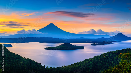 Volcanic lake sunrise landscape; tranquil islands; scenic vista; travel postcard