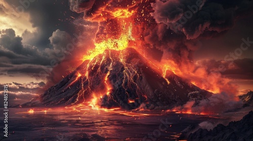 Volcano erupting hot lava and gases into the atmosphere. Lava spurting out of crater and smoke cloud