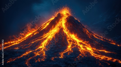 volcano, eruption, lava, fire, hot, magma, night, mountain, dark, sky, rock, earth, nature, disaster, danger, heat, orange, red, yellow, molten, flowing, explosive, powerful, destruction, hazardous, geothermal, seismic, active, crater, summit, glowing, mineral, ash, smoke, darkness, dramatic, fiery, natural, landscape, terrain, force, energy, spectacular, stunning, majestic, volcanic