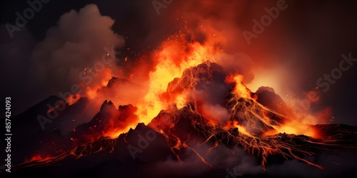 volcano, eruption, landscape, flowing, lava, magma, smoke, natural, disaster, inferno, destruction, danger, ash, heat, molten, rock, explosive, geology, catastrophy, column, flow, volcanic, activity, seismic, hazard, evacuation, emergency, devastation, hot, dangerous, gas, crater, island, plume, ventilated, zone, mountain, cone, cloud