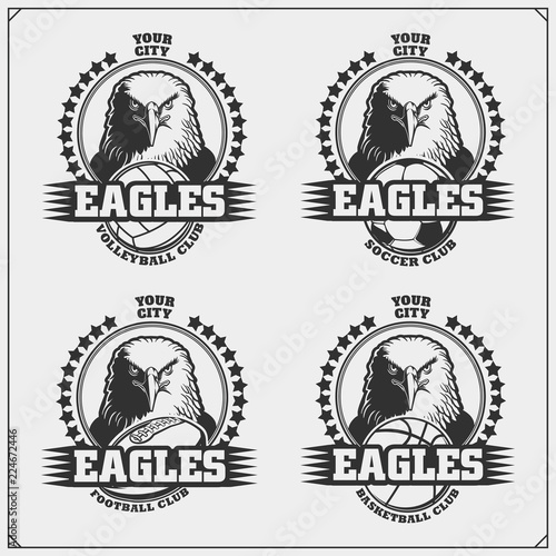 Volleyball, basketball, soccer and football logos and labels. Sport club emblems with eagle.