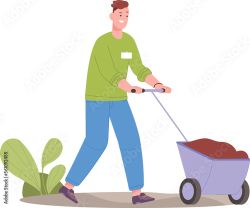 Volunteer gardening. Man pushing wheelbarrow with soil