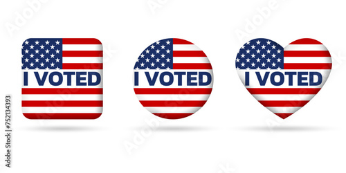 Vote icon, badge or sign set. I voted 3d sticker with USA flag. Voting, presidential campaign concept. American election design element. Vector illustration.