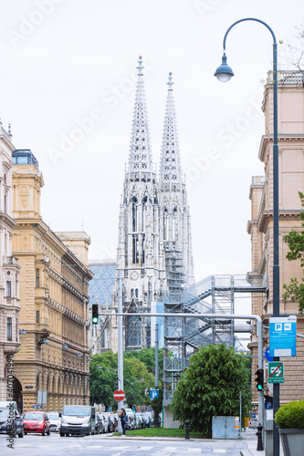 advert, ancient, architectural, architecture, art, attraction, austria, austrian, background, beautiful, bell tower, building, cathedral, church, european, famous, gothic, high, sky, style, tower, travel, vienna, votive, young