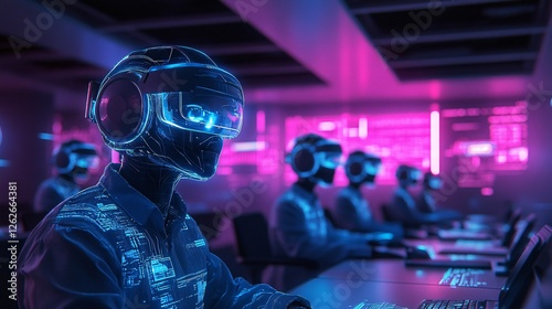 VR-equipped teachers using AI for online learning in the classroom, with holograms and smart technology illustrating futuristic education and interactive learning.
