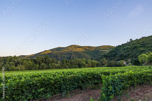 Vue au coucher du soleil du vignoble Saint-Chinian près du hameau de Ceps à Roquebrun