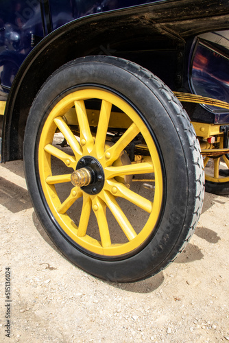 Vue de face d'une roue de voiture française du début du XXème siècle, cabriolet ancien, de collection