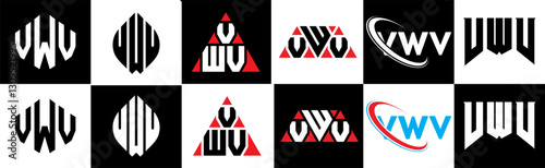 VWV letter logo design in six style. VWV polygon, circle, triangle, hexagon, flat and simple style with black and white color variation letter logo set in one artboard. VWV minimalist and classic logo