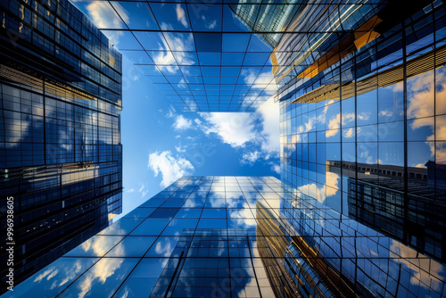 building, architecture, city landscape, skyscraper, city, modern, urban, goggles, perspective, downtown, construction, design, sky, business, structure, looking up, tower, futuristic, geometric, contemporary, skyline, window, travel, cloud, office, corporate, district, highrise, steel, tall, landscape, view, blue, blue skies, angle, exterior, light, technology, sunlight, commercial, finance, metropolis, symmetry, tour tourism, background, ai, environment, facades, line