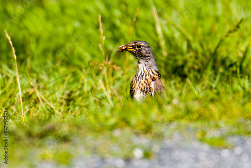 Wacholderdrossel ( Turdus pilaris ) bei der Futtersuche im Sommer