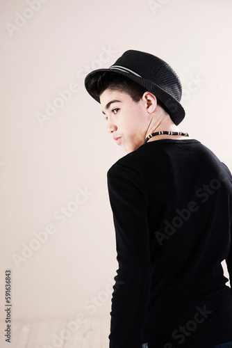 caucasian, colours, children, human, alone, hat, children, youth, individual, image, back, portrait, interior, childlike, accessory, jewellery, necklace, person, picture, 1, photograph, boy, youngster, humanity, 12, black hair, copy space, juvenile, studio shot, one person, white background, white, studio, black, indoor, male, color image, dark hair
