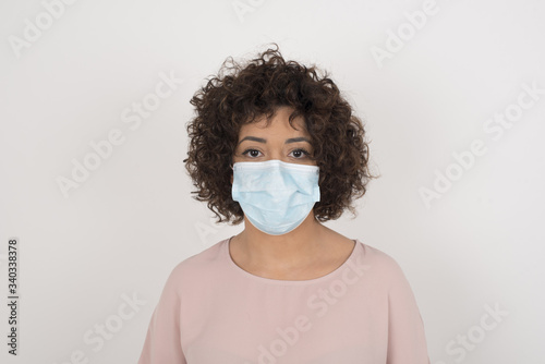 Waist up shot of joyful young woman wearing medical mask looking to the camera, thinking or wondering about something. Both arms down, neutral facial expression.