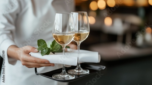 Waiter in a white uniform serving two glasses of white wine on a tray with a napkin and fresh mint. Elegant fine dining and hospitality concept.