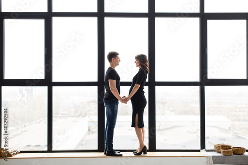 Waiting for baby, mammy's belly. Pair of future parents.Pregnant woman in romantic black dress hugging her huband and belly with hands. Black and white stylish. Elegant pretty woman waiting for baby