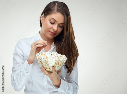 business, woman, isolated, white, corn, food, television, bowl, glasses, eat, emotion, concept, businesswoman, smile, hold, background, portrait, people, young, happy, student, girl, female, person, 1, arm, attractive, shirt, beautiful, beauty, caucasian, adult, pretty, lady, confident, success, successful, brunette, face, work, manager, men at work, hand, studio, job, hair
