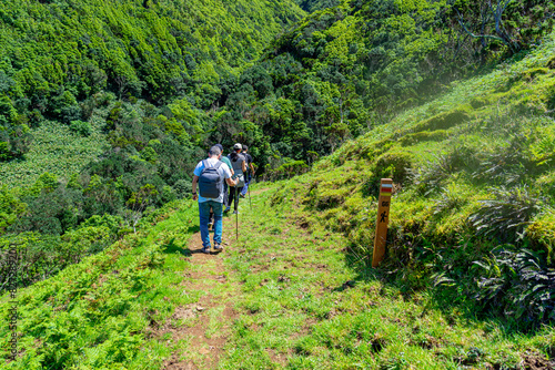 walkers heading towards Fajãs de Santo Cristo on the PR1 trail. São Jorge Island-Azores-Portugal