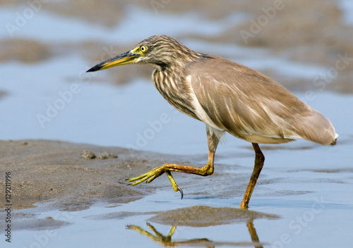 bird, indian, duck pond, heron, egret, water, beach, shore, reflected, walking, blue, nature, wild, wildlife, sea, bill, beak, half face, blurred background, asia, india, goa