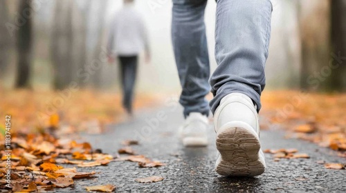 Walking through autumn leaves park trail photography foggy environment close-up view nature's tranquility