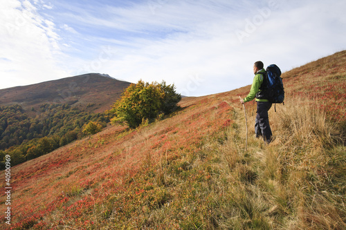 traveler, trekker, mountain, hiking, adventure, landscape, slope, autumn, sky, nature, season, countryside