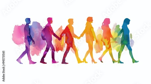 people, walking, group, together, harmony, diversity, oneness, colours, rainbow, watercolor, illustration, silhouette, graphic, design, art, human, lifestyle, teamwork, friendship, collaboration, community, connection, humanity, support, love, peace, acceptance, inclusion, tolerance, equality, hope, future, bright, optimistic, positive, joy, happy, smile, movement, progress, forward, walk, move