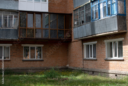 balcony, balcony, architecture, building, house, wall, brick wall, brick building, roof, apartment, facades, exterior, europa, european, urban, town, city, ukraine, window, structure, construction, brick, residential, grass, lawn, green