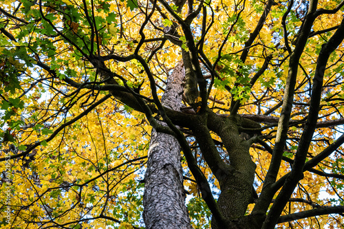 tree, autumn, nature, fall, leaf, leaf, forest, yellow, sky, tree branch, season, park, tree, foliage, blue, colours, branch, landscape, plant, wood, green, trunk, gold, maple, natural, background, bark, beautiful, beauty, bright, closeup, daytime, detail, environment, far, garden, grass, life, light, many