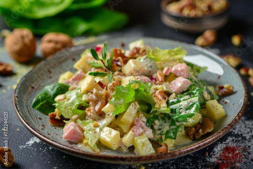 salad, potato, apple, walnut, red, nature, leaf, white, green, cheese, healthy, plate, vegetable, organic, dinner, snack, lunch, herb, lettuce, fork, arugula, celery, raw, closeup, freshness, image, nobody, portion, vegetarian