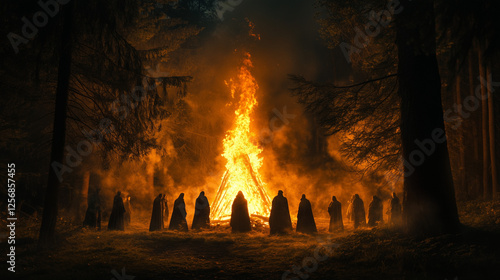 Walpurgis Night, A big bonfire is burning brightly in the middle of a dark forest on Walpurgis night, with silhouettes of people wearing robes and masks, Ai generated images