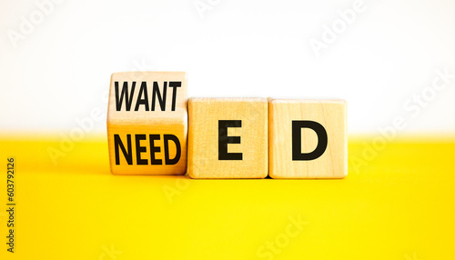 Wanted or needed symbol. Concept words Wanted or needed on wooden cubes. Beautiful yellow table white background. Business Wanted or needed concept. Copy space.