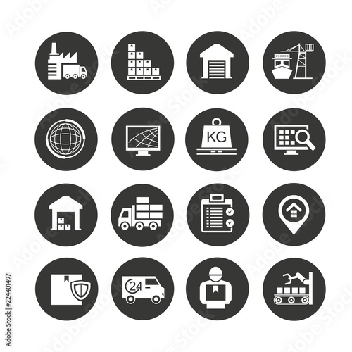 business, transport, box, cargo, delivery, dock, factory, globe, icon, illustration, industry, loading, logistic, manufacturing, pin, port, robot, search, shipping, signs, storage, symbol, tracking, transportation, truck, van, vector, warehouse, weight