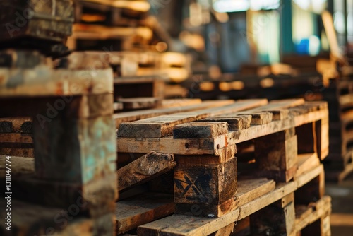 Warehouse filled with stacks of pallets. Shop production of wooden pallets for transportation and storage of goods.