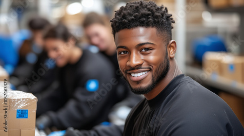 Warehouse Worker Smiling: A close-up shot of a happy and confident warehouse worker, showcasing his genuine smile and positive attitude. He's surrounded by colleagues and boxes.