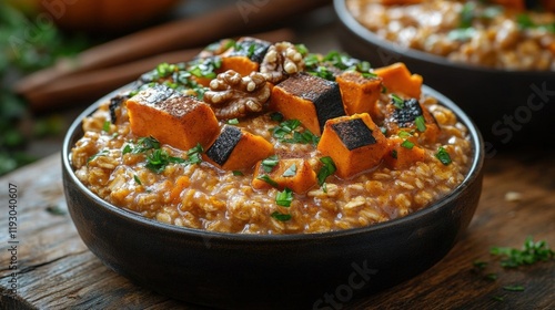 Warm and comforting autumn oatmeal with roasted pumpkin and walnuts