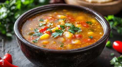 soup, comfort food, health food, home cooking, delicious, vegetarian, vegan, lunch, dinner, food photography, bowl, closeup, parsley, tomatoes, potato, red, orange, brown, green, spicey, hearty