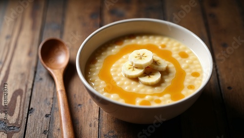 porridge, cornmeal, honey, banana, comfort food, bowl, rustic, wooden, warm, creamy, breakfast, dessert, sweet, spoon, inviting, gold, arc, light, shadow, cosy, homemade, kitchen, delicious, healthy, natural, organic, grain, texture, closeup, serving, traditional, wholesome, meal, soft light, atmospheric, dining, simplicity, warm colors, culinary, wooden table, receipe
