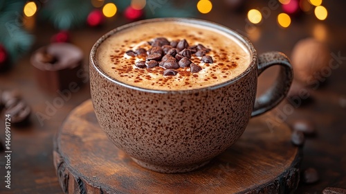 Warm and inviting cup of coffee topped with chocolate and sprinkles, surrounded by festive decorations in a cozy setting.