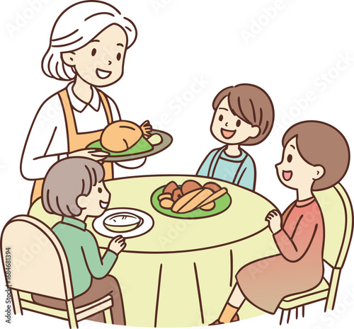 family, dinner, gathering, meal, people, together, home, food, eating, celebration, event, occasion, festive, happy, joyful, sharing, community, connection, love, warmth, cosy, domestic, lifestyle, illustration, vector, design, graphic, art, decoration, background, pattern, scene, table, kitchen, dining, eatery, hospitality, thanksgiving, christmas, holiday, party, social, togetherness, human relationships, children, adult, eltern, grandparent